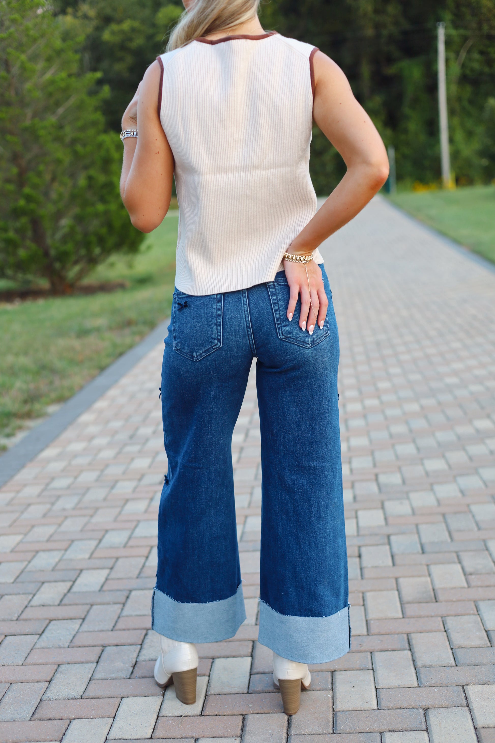 These high-rise dark wash jeans blend style and comfort effortlessly. Featuring a charming bow detail and a cuffed hem, they add a feminine touch to a classic silhouette. Designed to flatter your figure, these jeans provide a comfortable fit perfect for everyday wear, boosting your confidence with every step.