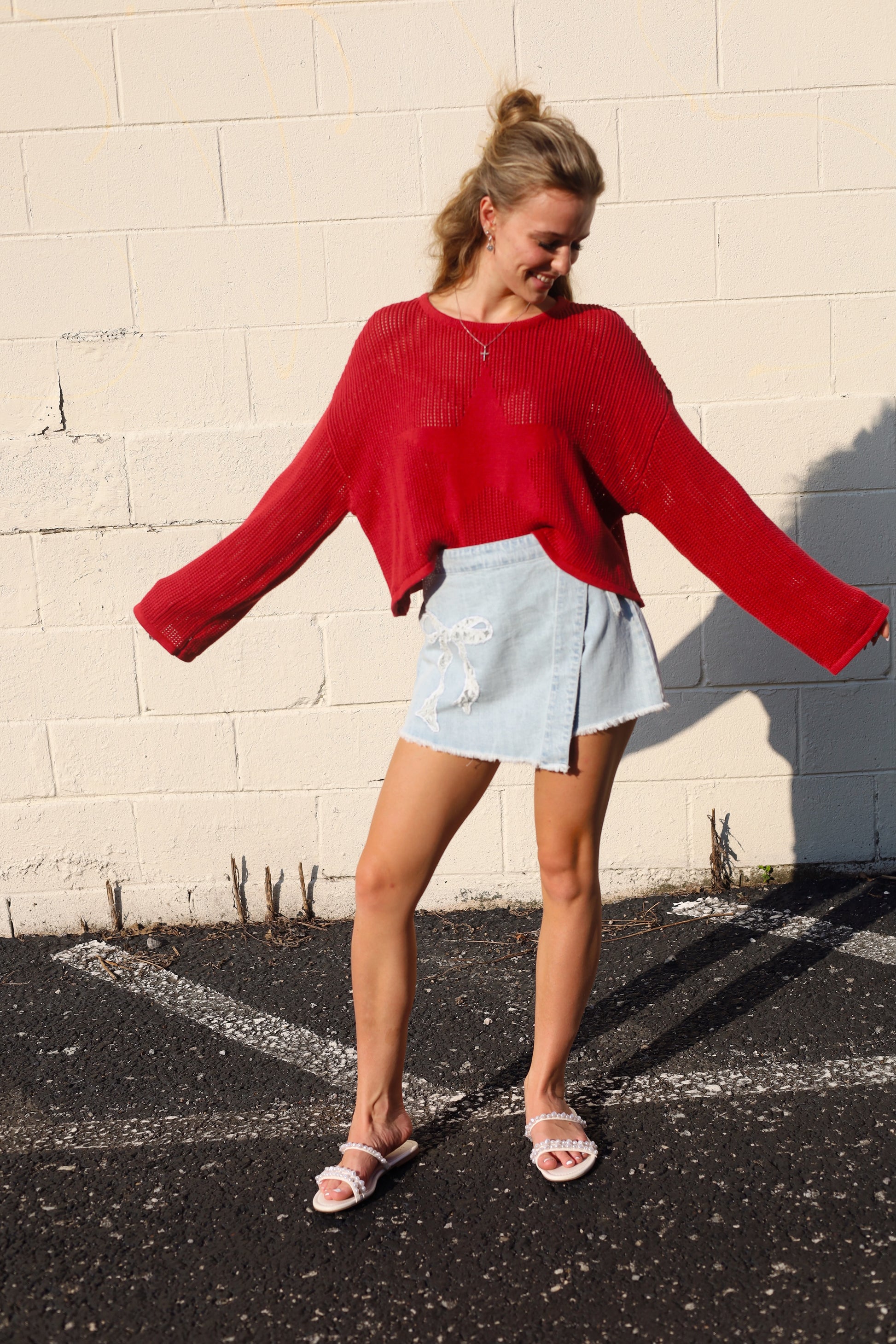 The Bella Skort offers a perfect blend of casual denim and delicate style with its wrap front design and charming lace bow detail.