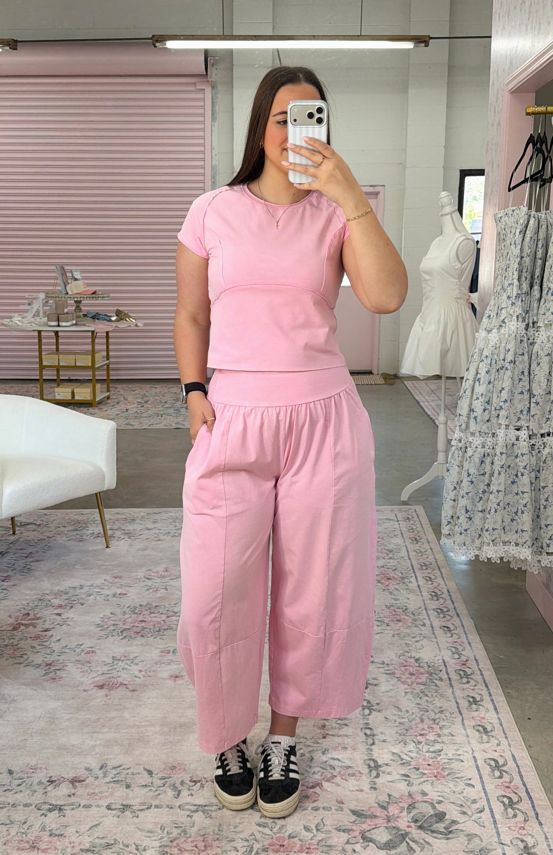 Effortlessly chic and supremely comfortable, these light pink mineral washed wide leg crop lounge pants are your new go-to for relaxed style. The soft, lived-in finish gives them an understated vintage vibe, while the generous wide leg silhouette offers freedom of movement. The relaxed fit makes them ideal for lounging, running errands, or casual hangouts with friends. Pairs perfectly with our Bubble Gum Top.