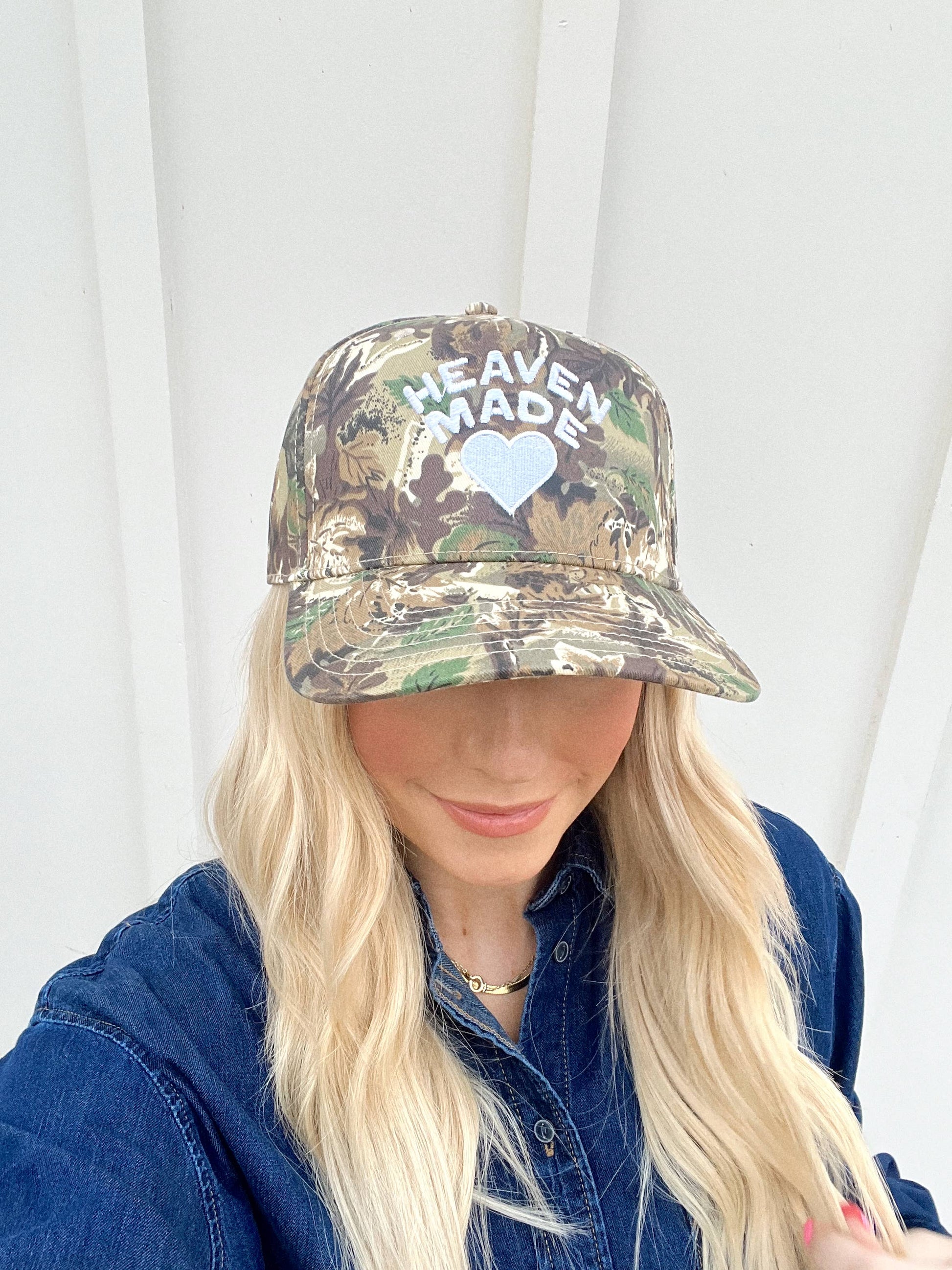 Elevate your style with our Heaven Made Hat, available exclusively at Ruby Moon! This camo 5-panel cap features the phrase “Heaven Made” beautifully embroidered in light blue and maroon or white thread.