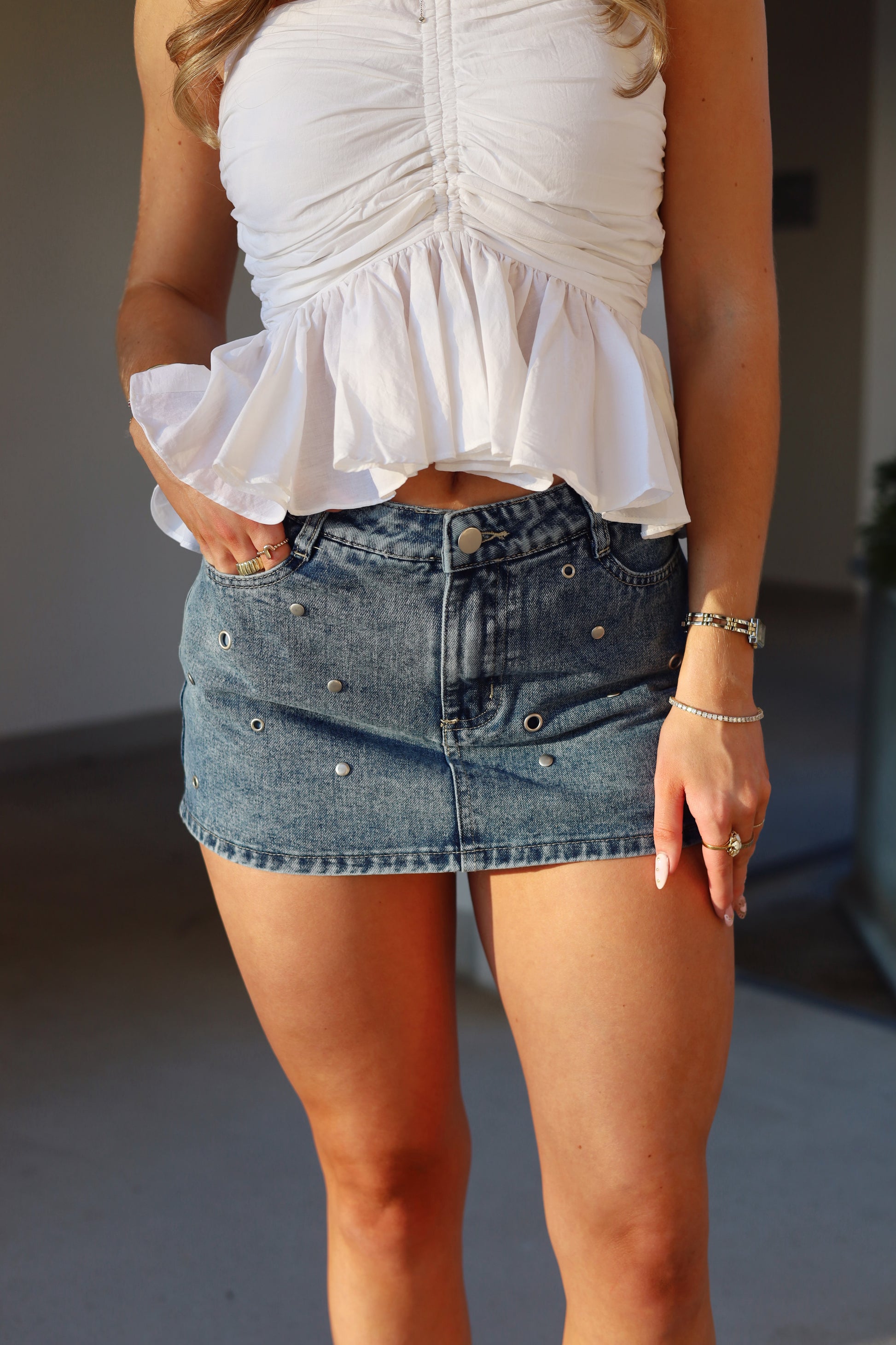 Meet your new go-to piece—the Celeste Denim Studded Skort. This hybrid style gives you the best of both worlds: the comfort of shorts with the cute factor of a skirt. The classic denim gets a fun upgrade with metal studs scattered across, giving it that effortless edge. Whether you're running errands, hanging with friends, or heading out for the evening, this skort adapts to whatever your day throws at you. Throw it on with your favorite tee and sneakers, and you're ready to go.