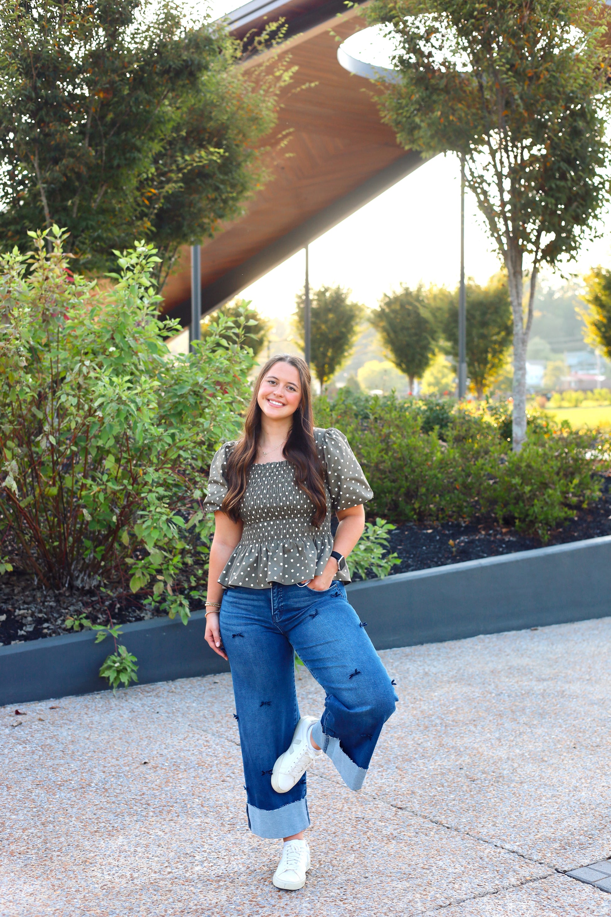 The Gabbie Polka Dot Peplum Top features an olive green hue with charming puff sleeves, delicate polka dots, and a smocked bodice that offers a comfortable, flattering fit. Its peplum silhouette creates a feminine shape perfect for both casual outings and special occasions. This top effortlessly blends style and ease, making it a versatile addition to your wardrobe.