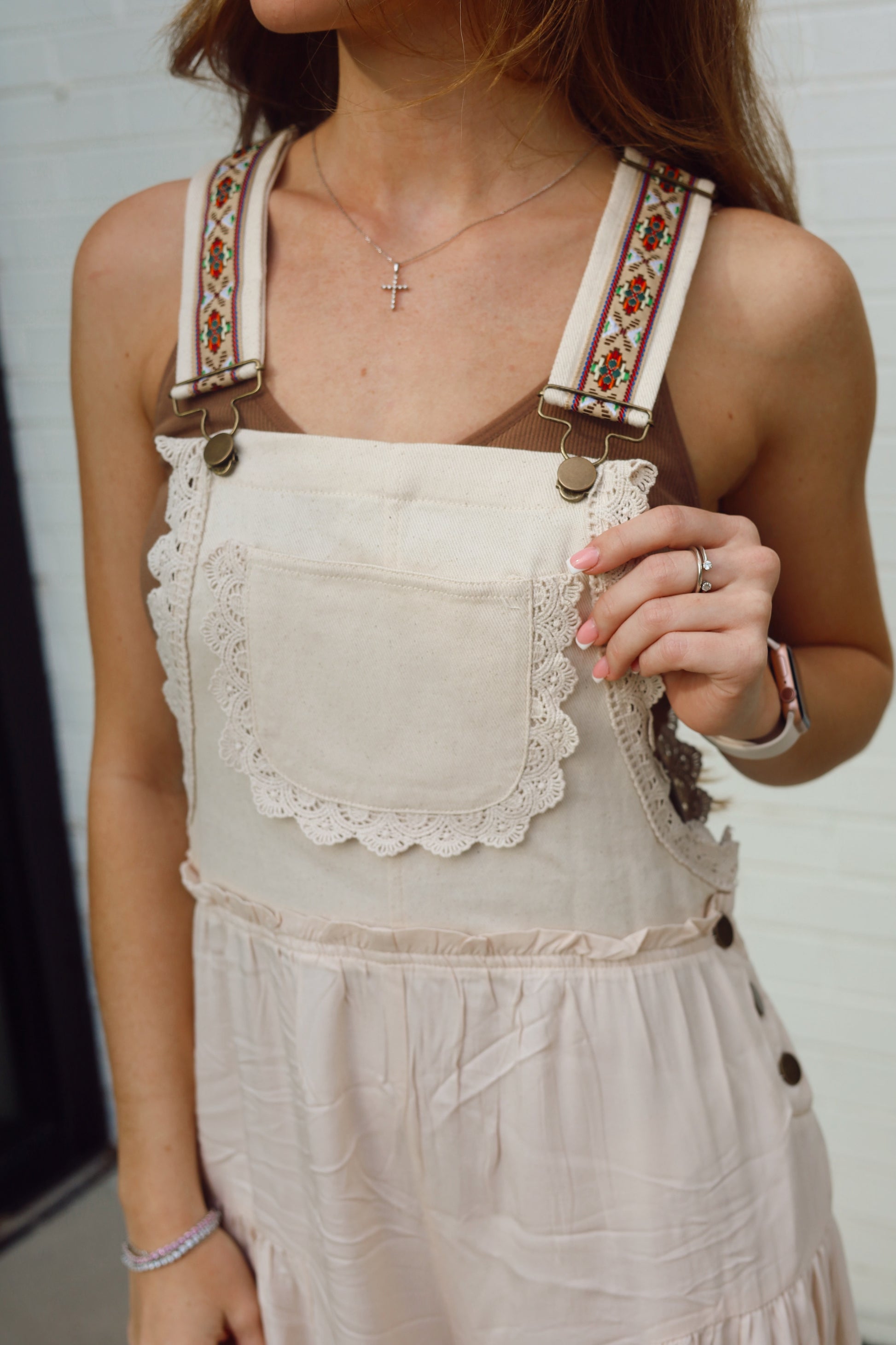 Effortlessly flow through your day in our Go With The Flow Overalls. These cream overalls feature adjustable straps and button fastening for added comfort. The loose fit and wide legs create a relaxed silhouette, while the lace trim detailing adds a touch of femininity. Perfect for any casual occasion.