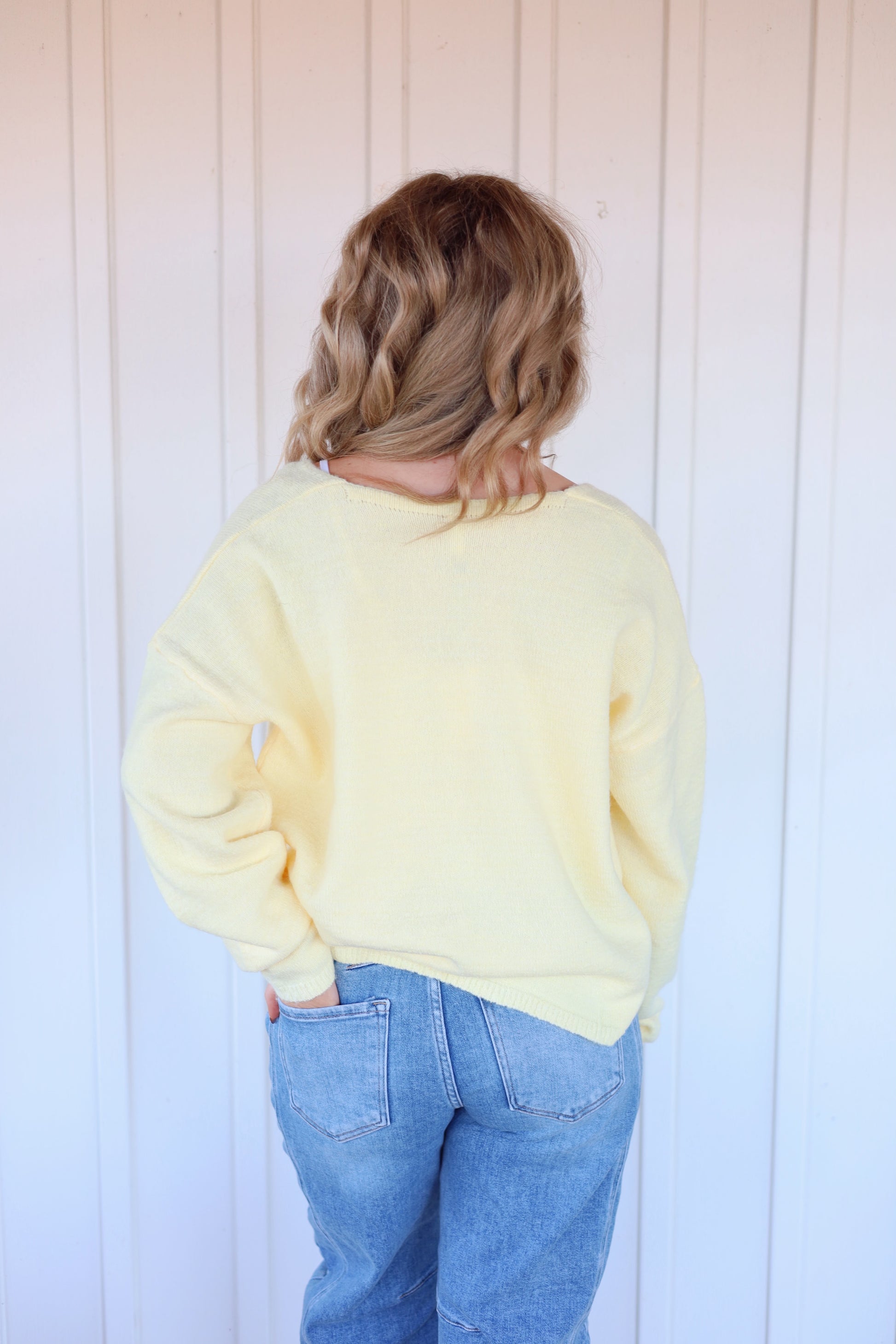 Elevate your everyday style with the Nora Tie Sweater in a cheerful yellow hue. This versatile piece features a charming tie detail that adds personality and dimension to your wardrobe. The soft, comfortable fabric makes it an easy go-to for year-round wear. Whether you're heading to brunch or the office, this sweater supports your confidence with its flattering silhouette and timeless appeal.
