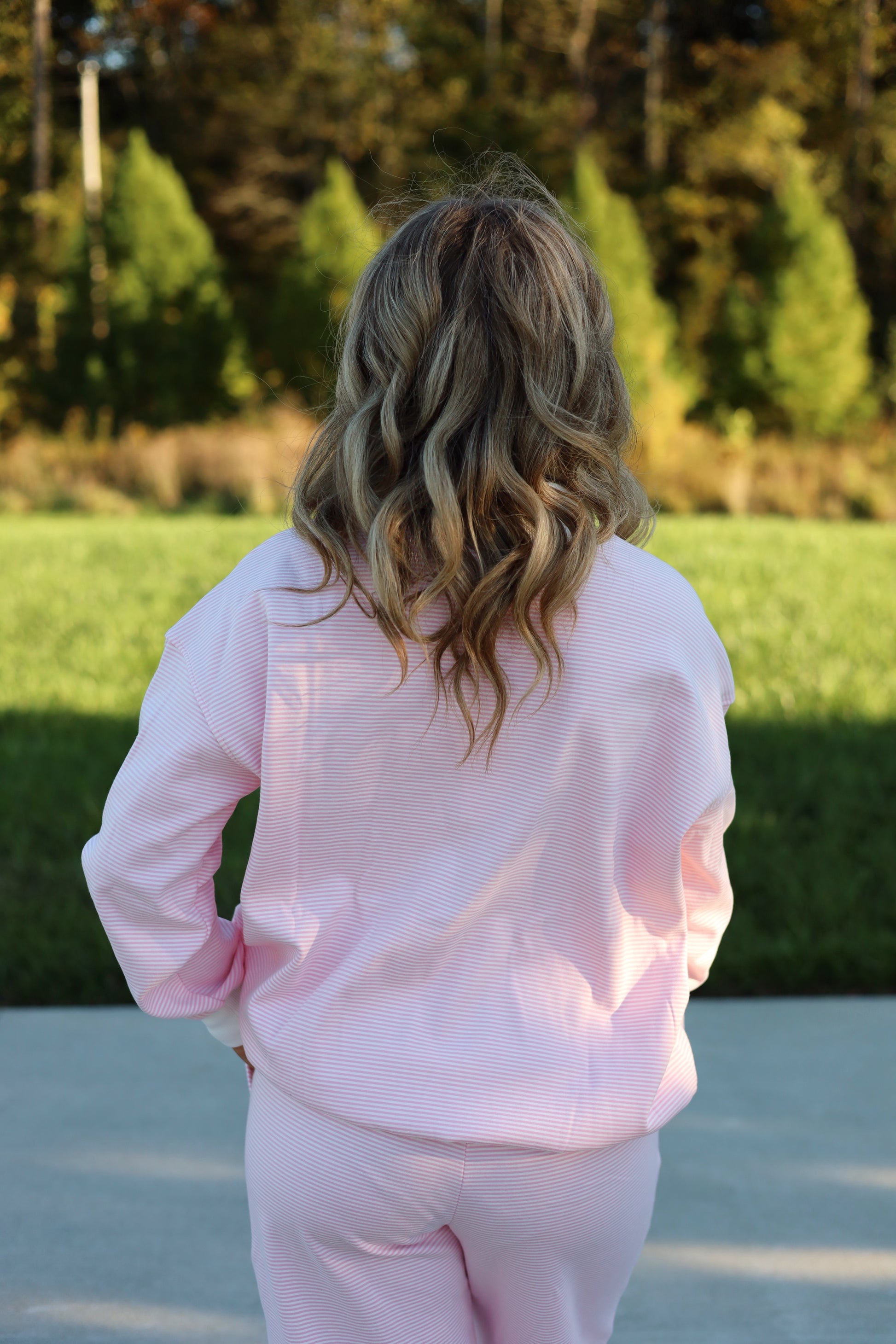 Experience cozy style with the Raegan Pink Stripe Set, featuring a pink and white striped mock neck sweatshirt paired with matching sweatpants. This set offers warmth and comfort for relaxing days or casual outings, making it an easy go-to for effortless, laid-back looks. Perfect for staying comfortable while looking put-together.