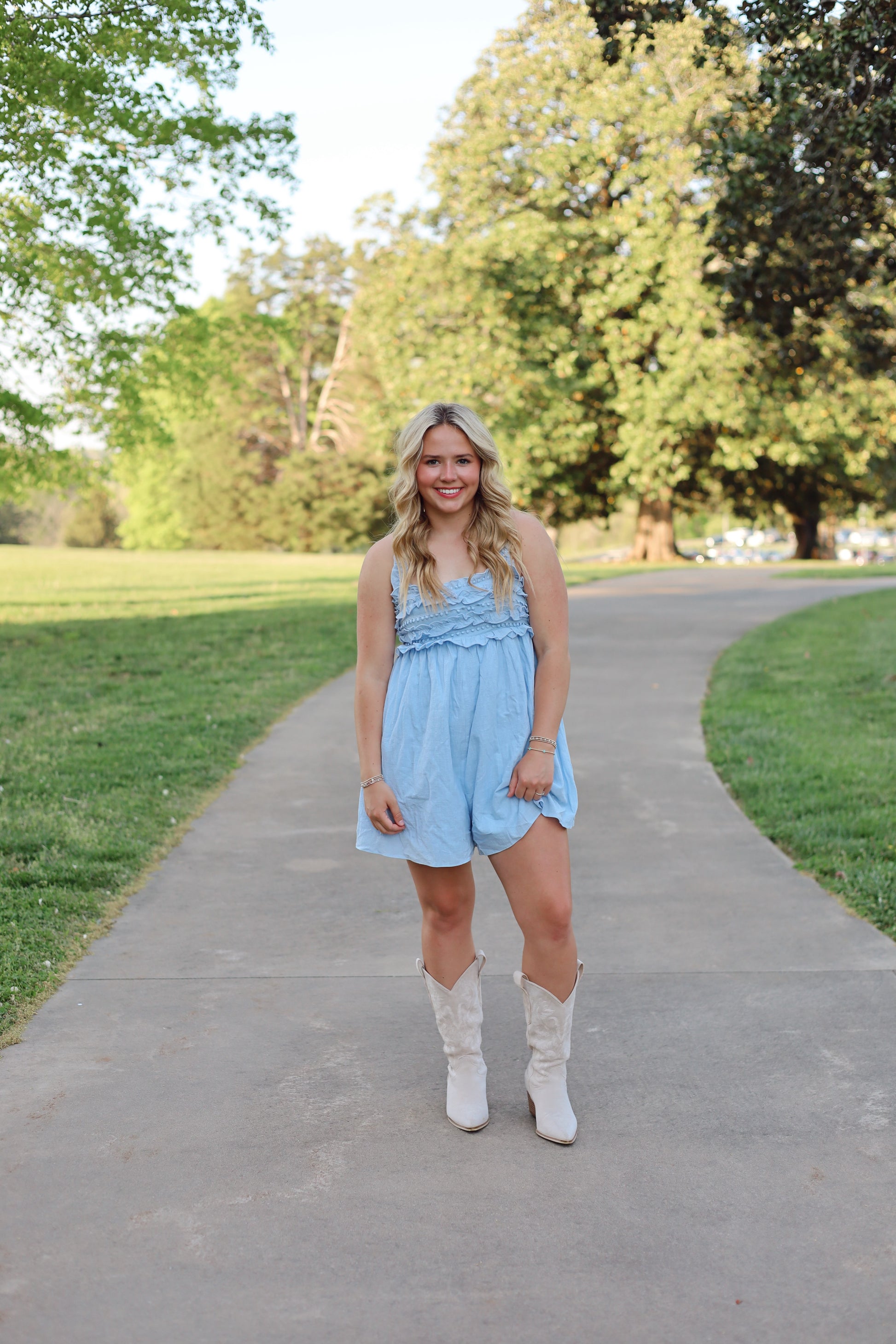 The Sadie Ruffle Romper is the perfect addition to your wardrobe. This powder blue romper features delicate ruffle detailing and an adjustable open back with a tie, allowing for a customizable fit.