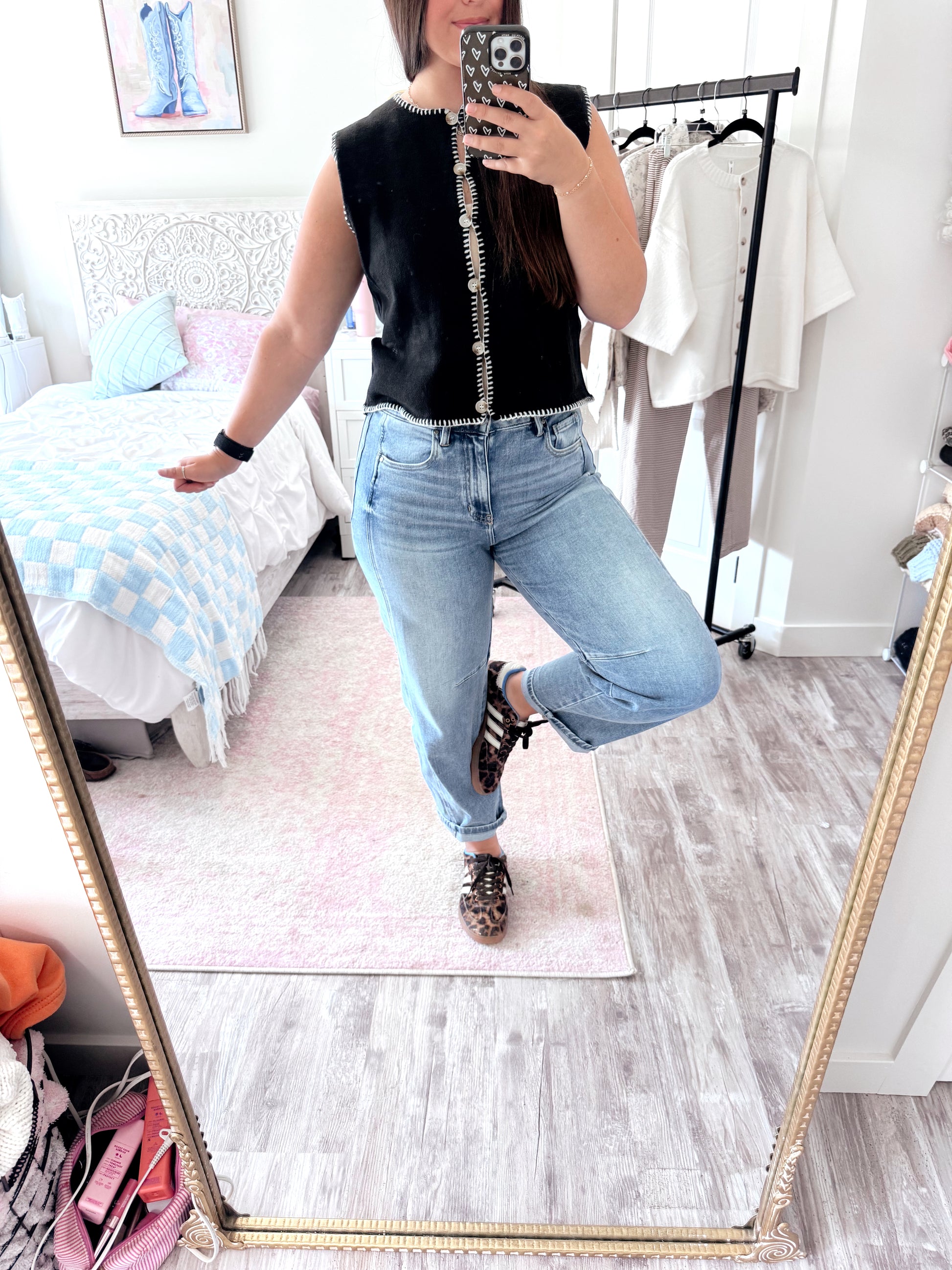 The Sloane Sweater Top combines cozy comfort with stylish details. Its black fabric is accented by cream stitching and a button-front design, creating a versatile piece that’s easy to dress up or down. Perfect for layering or wearing on its own.