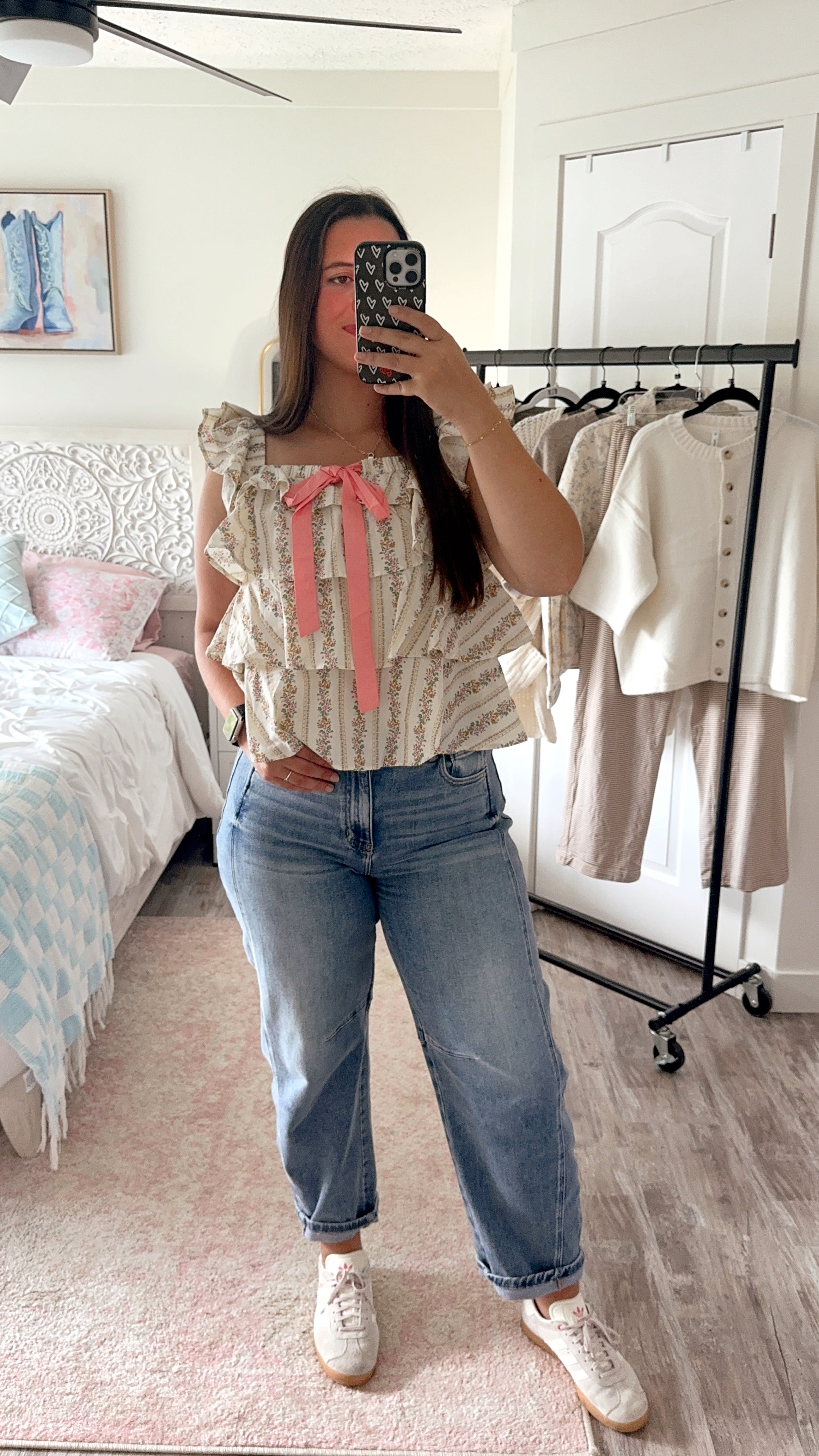 The Zoe Floral Top features soft layers of cream, pink, and green floral fabric that create a delicate, flowy silhouette. A charming pink bow detail adds a feminine touch, making it an easy choice for a comfortable yet stylish outfit. Its light design ensures you stay comfortable while looking effortlessly graceful.
